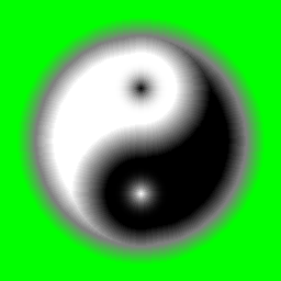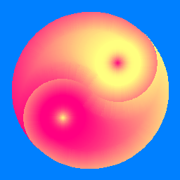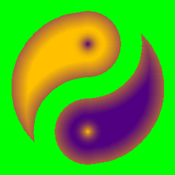 太極図(陰陽魚)の、白と黒の間や、背景との間にグラデーションに取ったりしたものを作成します。 大きさや色の組み合わせ、角度などは自由に指定できます。 ただ、精度的に難しい所があって、普通の太極図を作るのには向いてないと思います…。