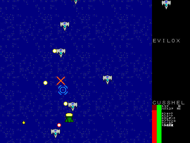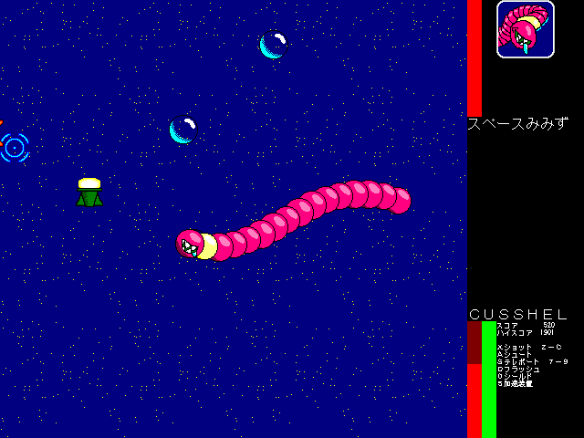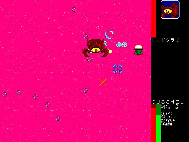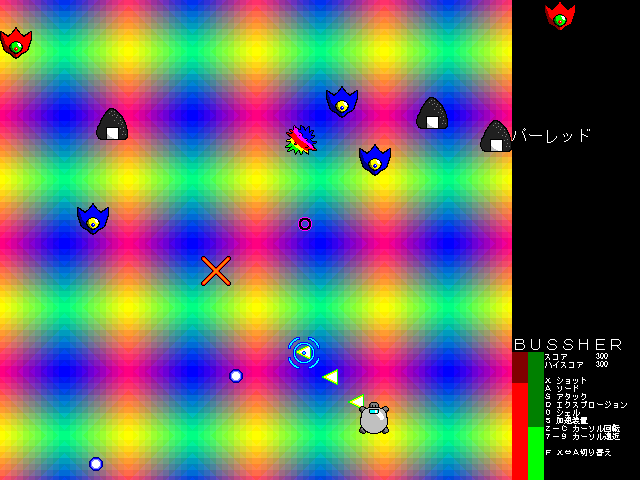 スッポン型円盤を操作して敵を倒していきます。 基本的な内容はほぼ下の『BUSSHER-零』と同じですが、ステージが8つになっていて、2つの武器それぞれが3段階に強くなります。 一度到達したステージは、後から自由に選べるようになります。 また、一応効果音が出ます。 最初から8までやろうという場合は、同封されてるbussher_.datをbussher.datに改名すると、全てのステージがプレイできる状態になります。