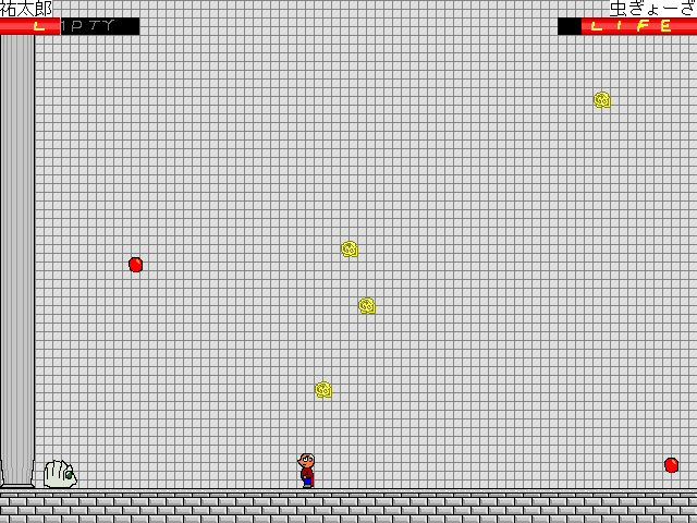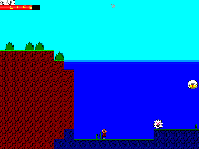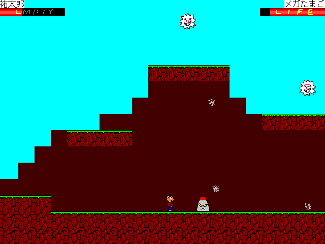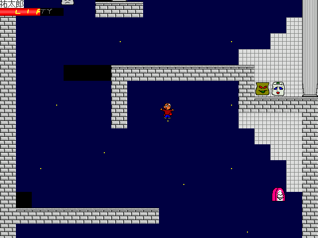 裕太郎という人物を操作し、ひたすら剣や空気の刃で敵を倒しながら進んで行きます。 6つの通常ステージ+3つのおまけステージの、計9ステージががあります。各々かなり短いです。 一度到達したステージは、後から自由に選べるようになります。 うまくいけば7分程で6までクリアできてしまったりします。
